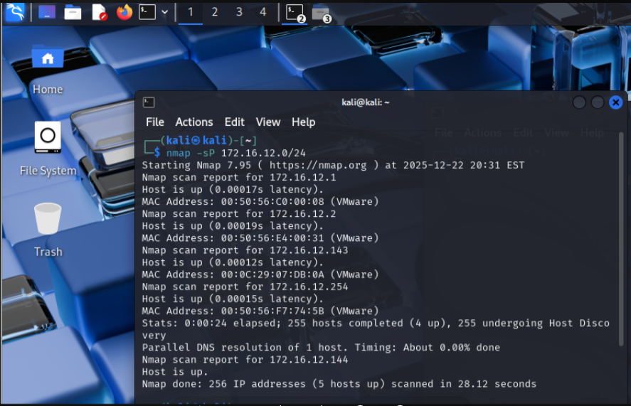 172.16.12.1、.2、.254:VMware 网关设备(MAC 地址以00:50:56开头)172.16.12.143:VMware 虚拟机(MAC:00:0C:29:07:DB:0A)172.16.12.144:攻击机自身