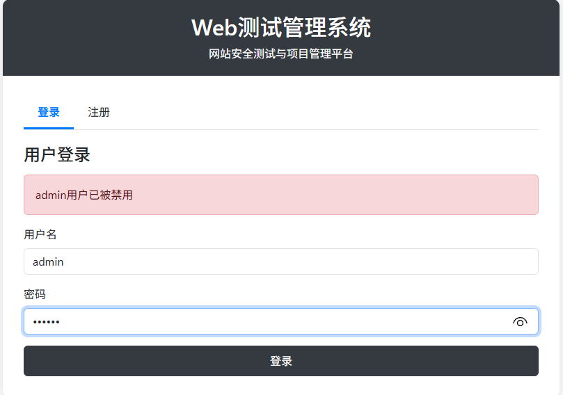 在登录框中输入常见 payload(admin' OR '1'='1 --),但未绕过验证,页面仅提示“用户名或密码错误”。后端可能使用预编译语句或强过滤,SQL 注入不可行。切换至“注册”标签页,填写用户名 jhin 与简单密码 123,提交后成功跳转至欢迎页: