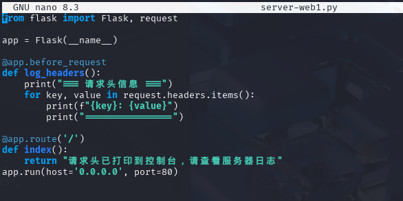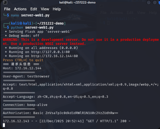 为了进一步利用 SSRF,我在 Kali 上编写了一个简易 Flask 服务,用于记录所有来自靶机的 HTTP 请求头:
