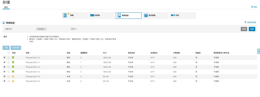 进iDRAC → 存储 → 物理磁盘,能看到两块盘状态是"外来",图标是黄色感叹号。