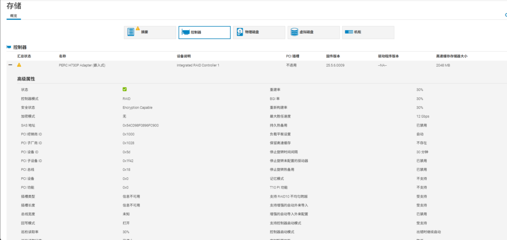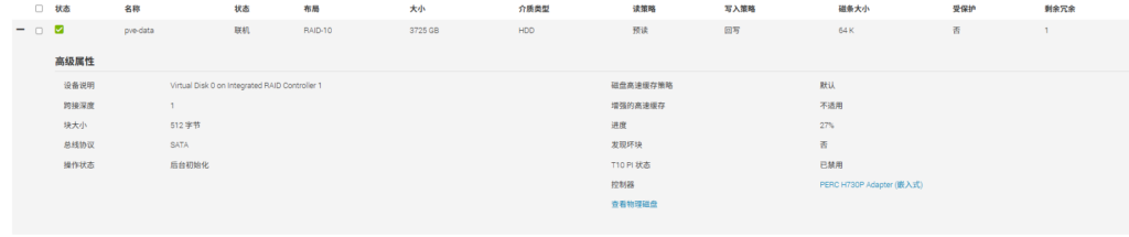 这台机器比较特殊,iDRAC里没有直接的导入外来配置按钮,但从存储事件日志来看,系统其实已经自动重新识别并重建了虚拟磁盘,虚拟磁盘页面显示pve-data状态联机,RAID 10正常。