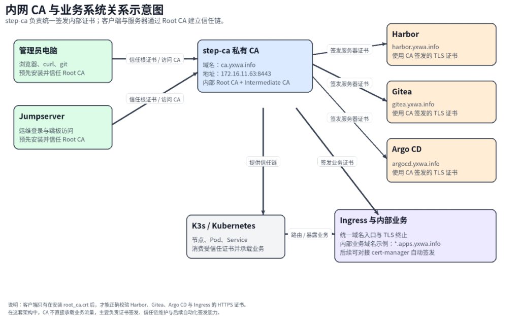 在内网环境里推进 Harbor、Gitea、Argo CD、Ingress 这一类平台建设时,证书问题往往会很快暴露出来。浏览器访问需要 HTTPS,镜像仓库需要可信证书,Kubernetes 里的服务发布也离不开统一的 TLS 体系。如果前期没有把证书基础设施搭起来,后面每接一个系统,都会重复处理一次信任链和证书签发的问题,很麻烦,排错也容易失控。