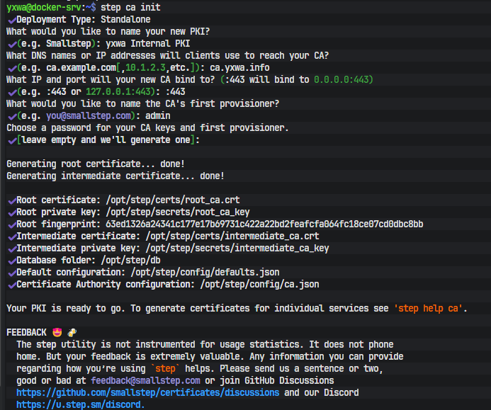 整个初始化过程采用交互式方式完成,部署类型选择 Standalone,PKI 名称填写为 yxwa Internal PKI,CA 对外访问地址填写为 ca.yxwa.info,监听地址最初填的是 :443(其实该填一千往后,443这里需要root)