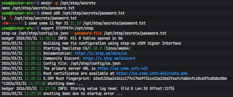 初始化结束后,下一步是先手工启动 step-ca,验证服务本身是否能跑起来。由于 step-ca 启动时需要解密密钥,因此先把初始化阶段设置的密码写入单独的密码文件中,便于服务读取: