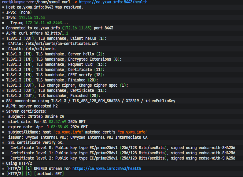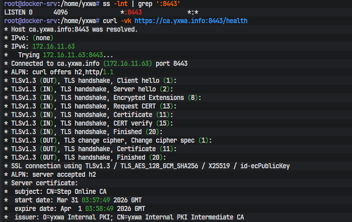 当 /health 接口返回状态正常时,就说明 step-ca 已经真正开始对外提供 HTTPS 服务。