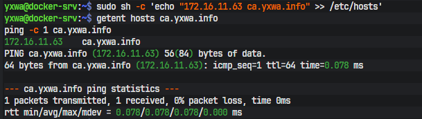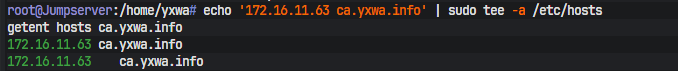echo '172.16.11.63 ca.yxwa.info' | sudo tee -a /etc/hosts