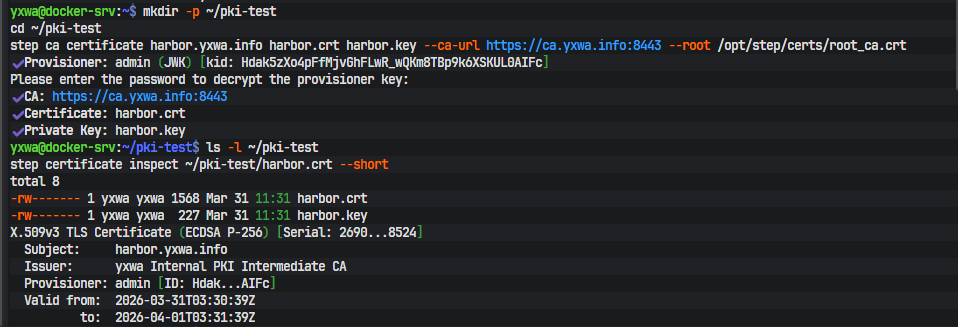 step ca certificate harbor.yxwa.info harbor.crt harbor.key \