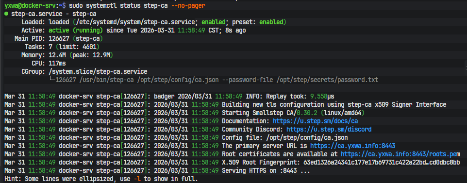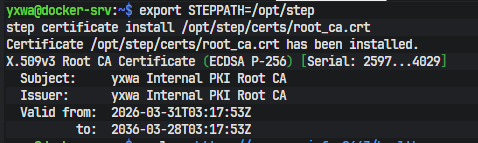 本次实践中的 CA 服务器运行在 Ubuntu 24.04 LTS 上,主机名为 docker-srv,IP 地址是172.16.11.63。为这台 CA 服务器规划的业务访问域名是 ca.yxwa.info。我的后续计划由这套 CA 为 harbor.yxwa.info、gitea.yxwa.info、argocd.yxwa.info 等内部业务域名签发证书。