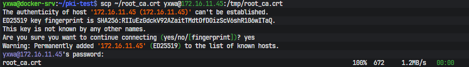 这样就得到了一个标准分发文件 root_ca.crt,后续可以通过 scp 复制到其他 Linux 主机。