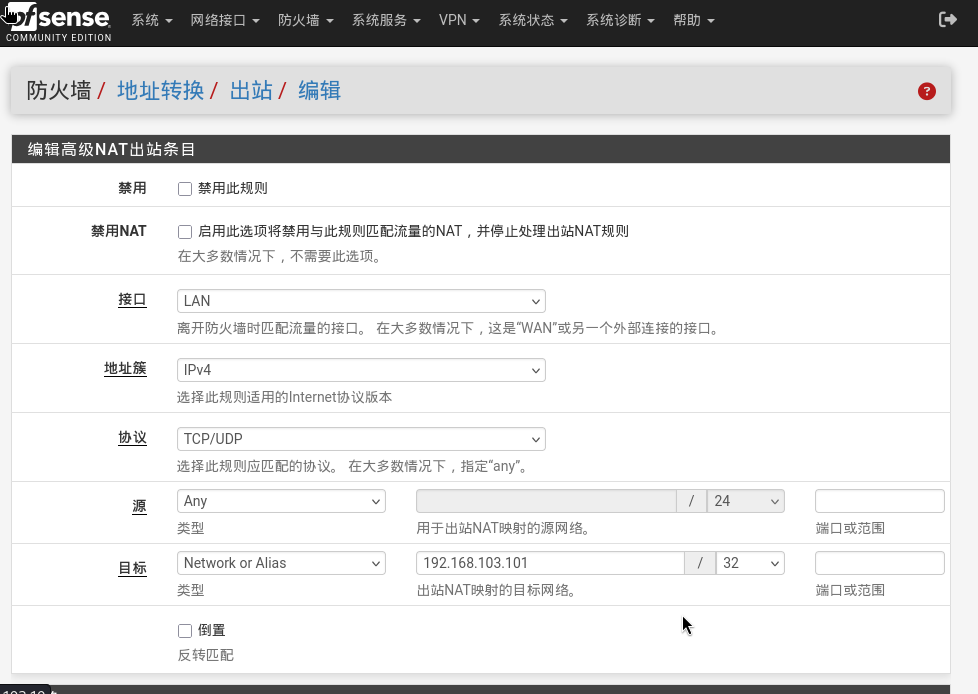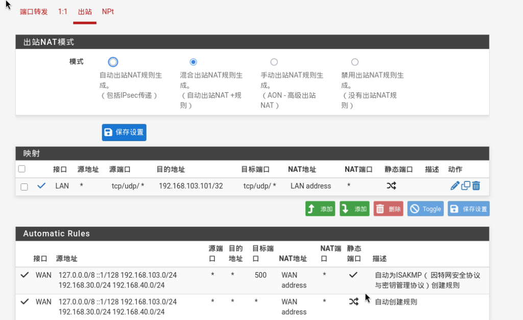 混合出站:pfSense 默认是自动模式,自动生成的规则只管内网上网,不会帮你做这种定向伪装。切到混合模式后,手动规则优先级高于自动规则,但自动规则依然保留——内网设备正常上网完全不受影响,只是多了这么一条"特权规则"来解决端口映射的回流问题