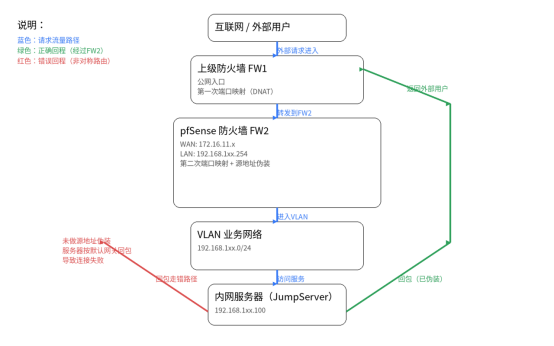 解决办法就是图里绿色箭头走的那条路:在 FW2 上加一条 Outbound NAT 规则,把进入 VLAN 的流量源地址伪装成 FW2 自己在该网段的接口 IP(192.168.1xx.254)。这样 JumpServer 看到的请求源地址就是 FW2,回包自然会交还给 FW2。FW2 拿到回包后,反向还原 NAT,沿原路经 FW1 返回给外部用户。整条链路闭合,端口映射才算真正打通。
