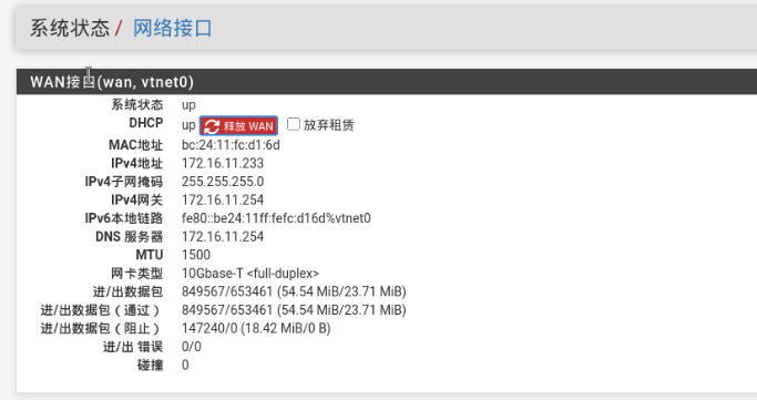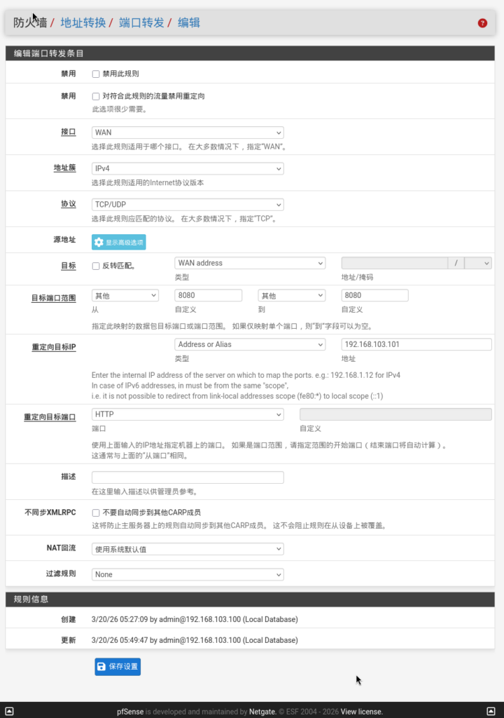 有一个地方需要注意:过滤规则那里选的是 None。这意味着 pfSense 不会自动在 WAN 口上生成对应的防火墙放行规则。你需要手动去 防火墙 → 规则策略 → WAN 标签页下,确认有一条放行目标端口 8080 的规则,否则流量到了 WAN 口会被默认的拒绝规则挡掉,端口转发虽然配了但根本匹配不到流量。如果当初配的时候选了"添加关联的过滤规则"就不用操心这步,但既然这里选的 None,就得自己补。