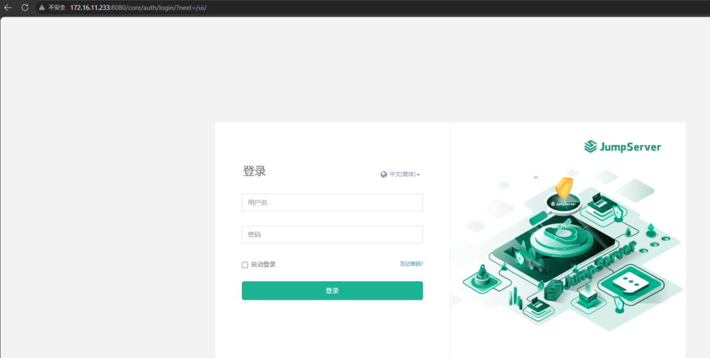 浏览器地址栏显示 172.16.11.233:8080,页面已经跳转到了 JumpServer 的登录界面。这意味着整条链路完全跑通了:外部请求从 172.16.11.x 网段出发 → 经过 FW1 → 到达 pfSense FW2 的 WAN 口 → 端口转发将 8080 映射到内网 192.168.103.101:80 → JumpServer 收到请求后回包给 FW2(因为出站 NAT 伪装了源地址)→ FW2 沿原路返回。整个双层防火墙的端口映射闭环,到此完成。