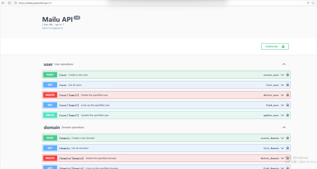 Mailu 已启用 API,且 API=true、WEB_API=/api,Swagger 可从 /api/v1/swagger.json 读取。