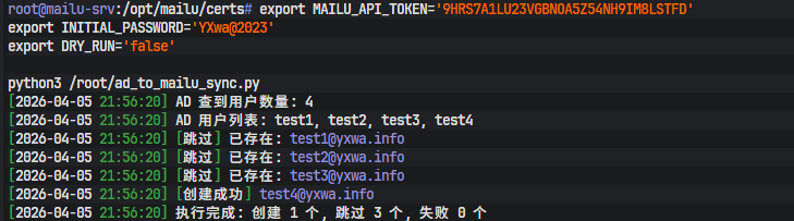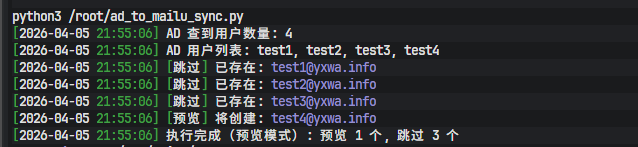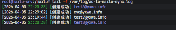 相比直接让 Mailu 原生接管 AD 登录,这种方式更稳,也更容易渐进式落地:先打通同步创建邮箱,再考虑更复杂的统一认证方案。
